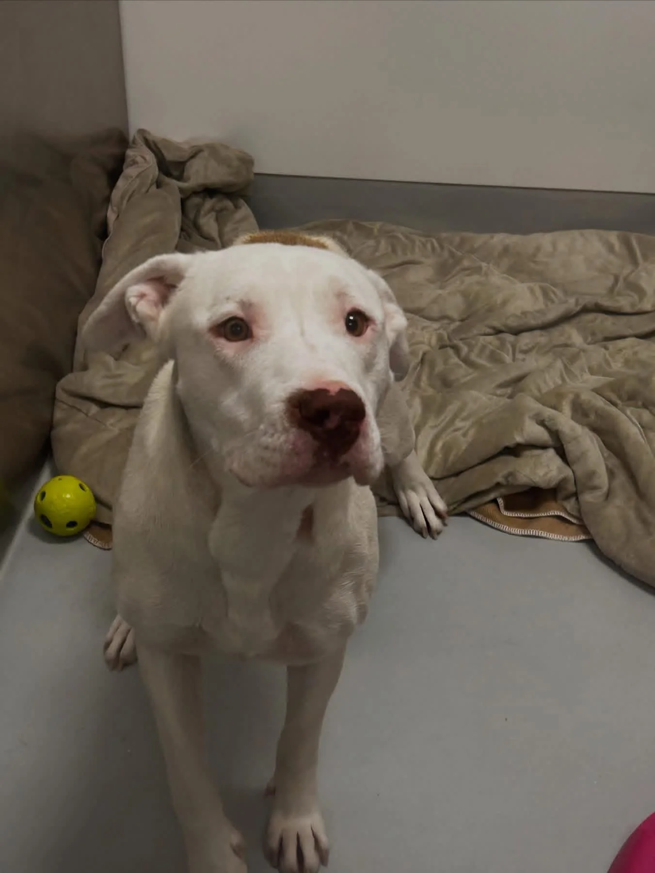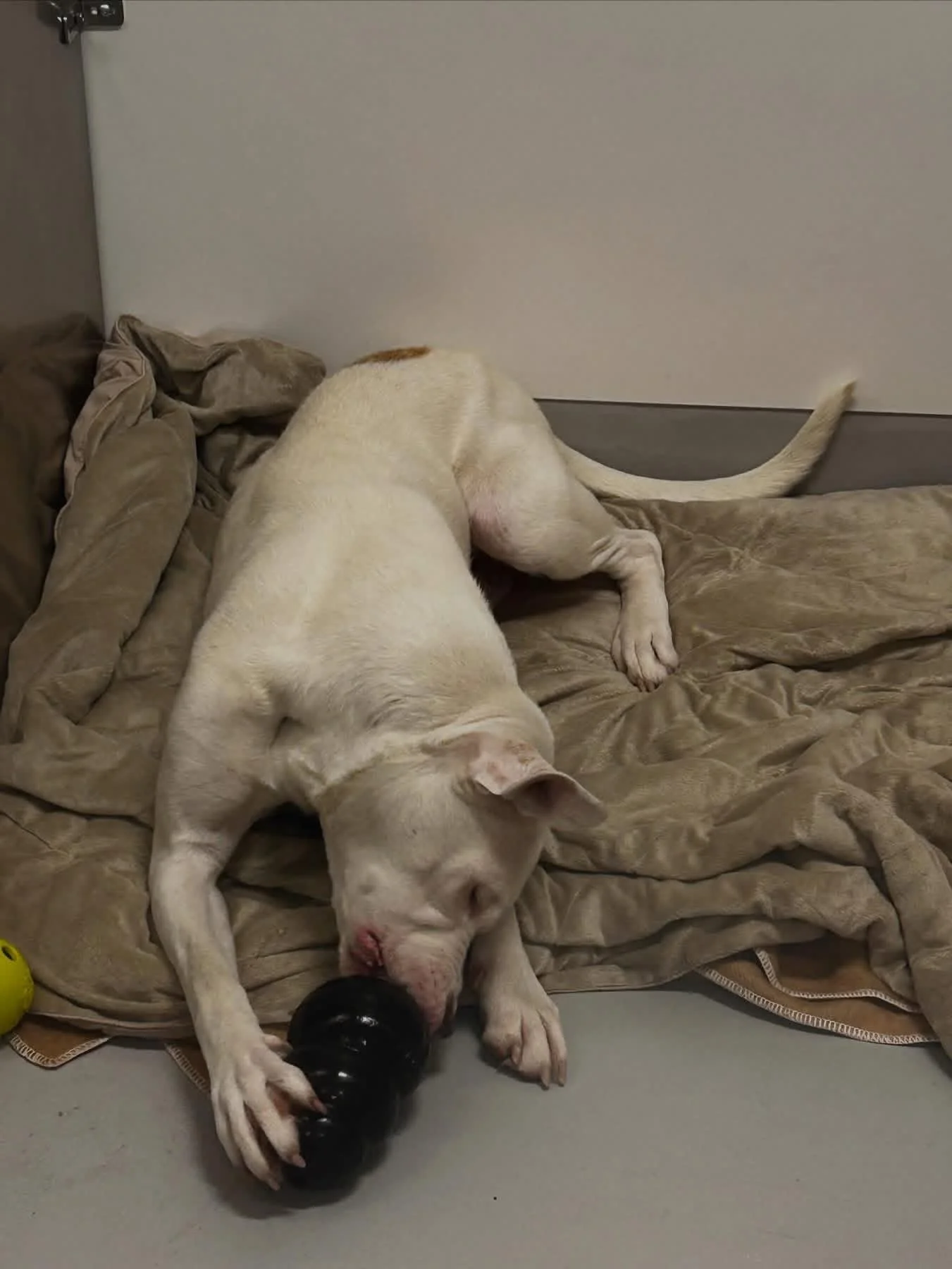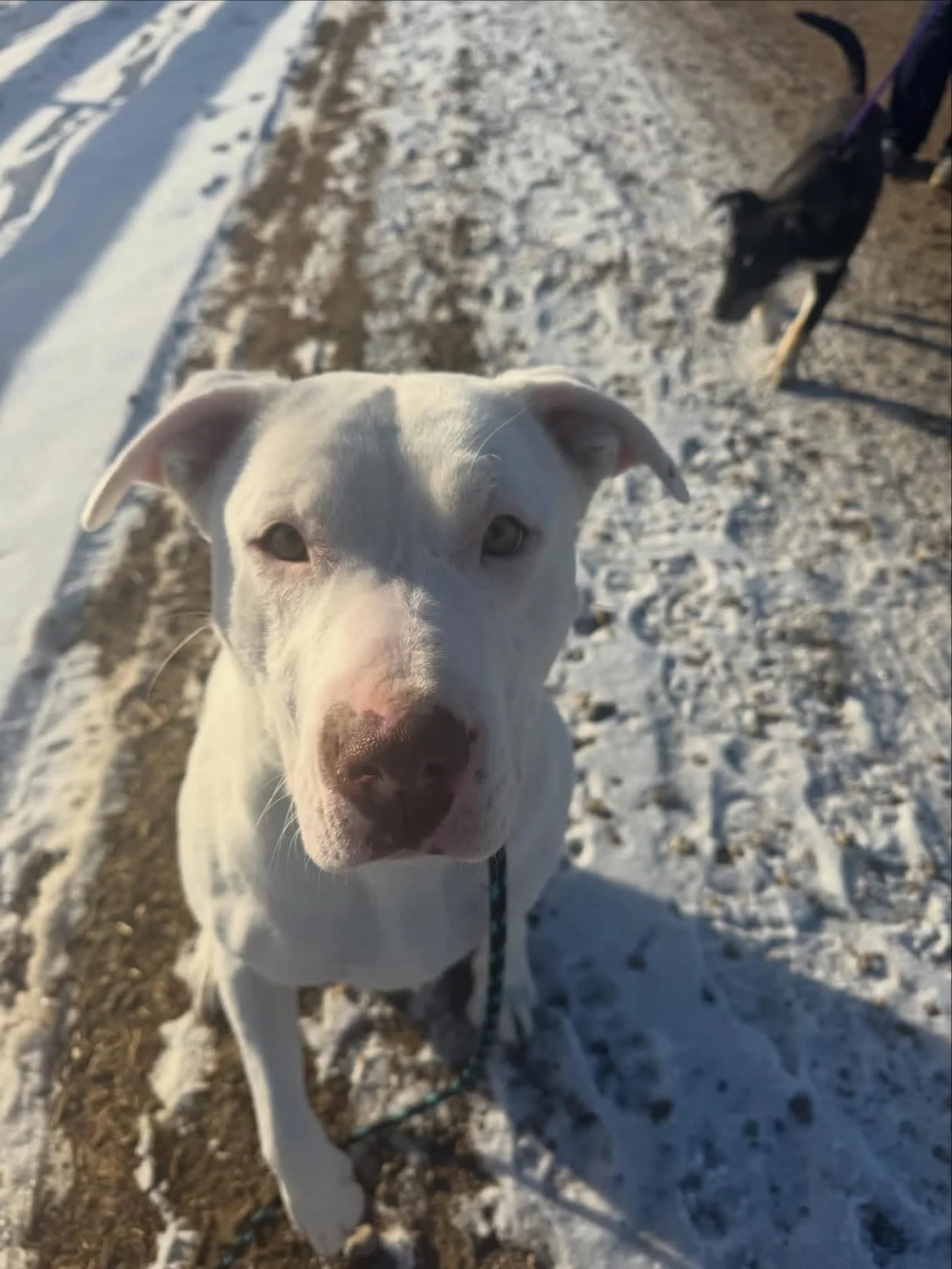 This sweet pup adores people and tries her best to please, she is walking very well on the leash and is so proud of herself when she is listening. She is a wonderful dog that I get to love more and more each day. Lottie can be overwhelmed by other dogs, but she is slowly enjoying the company of other dogs and really enjoys the pups at the shelter . Lottie loves to play with her Kongs and is a very big fan of food and loves thinking through her puzzle feeders. With a little patience and a lot of love, Lottie will make an incredibly loyal companion to someone who sees just how special she truly is”