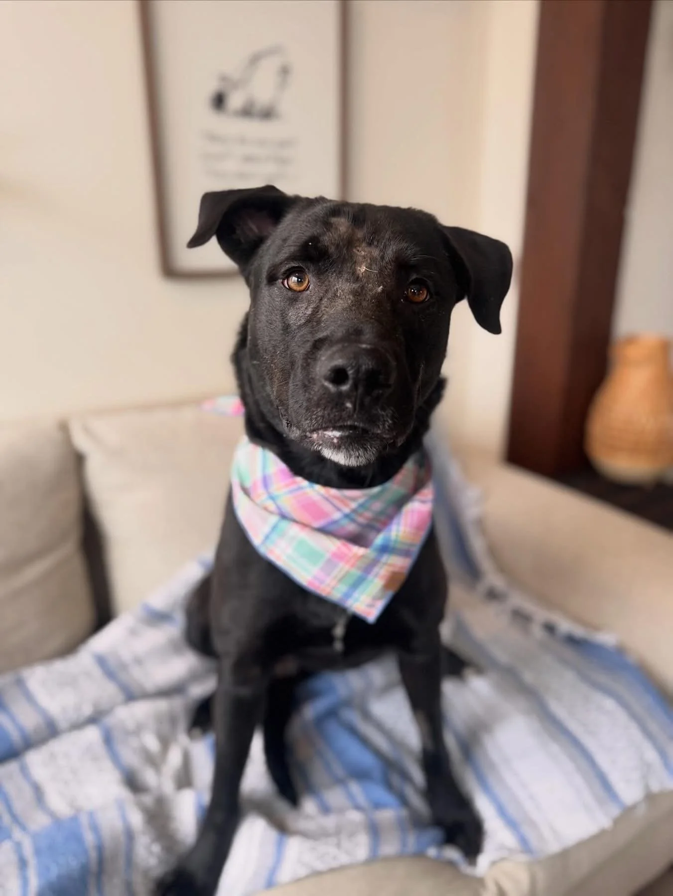 Mavis is a smart and curious girl, who already knows some basic commands but she does have a bit of a mischievous streak and is known to be an escape artist! Because of this, she’ll need a home with a tall, secure, and well-maintained fence to keep her safe while she explores. She can be vocal when alone but settles down when she has company.