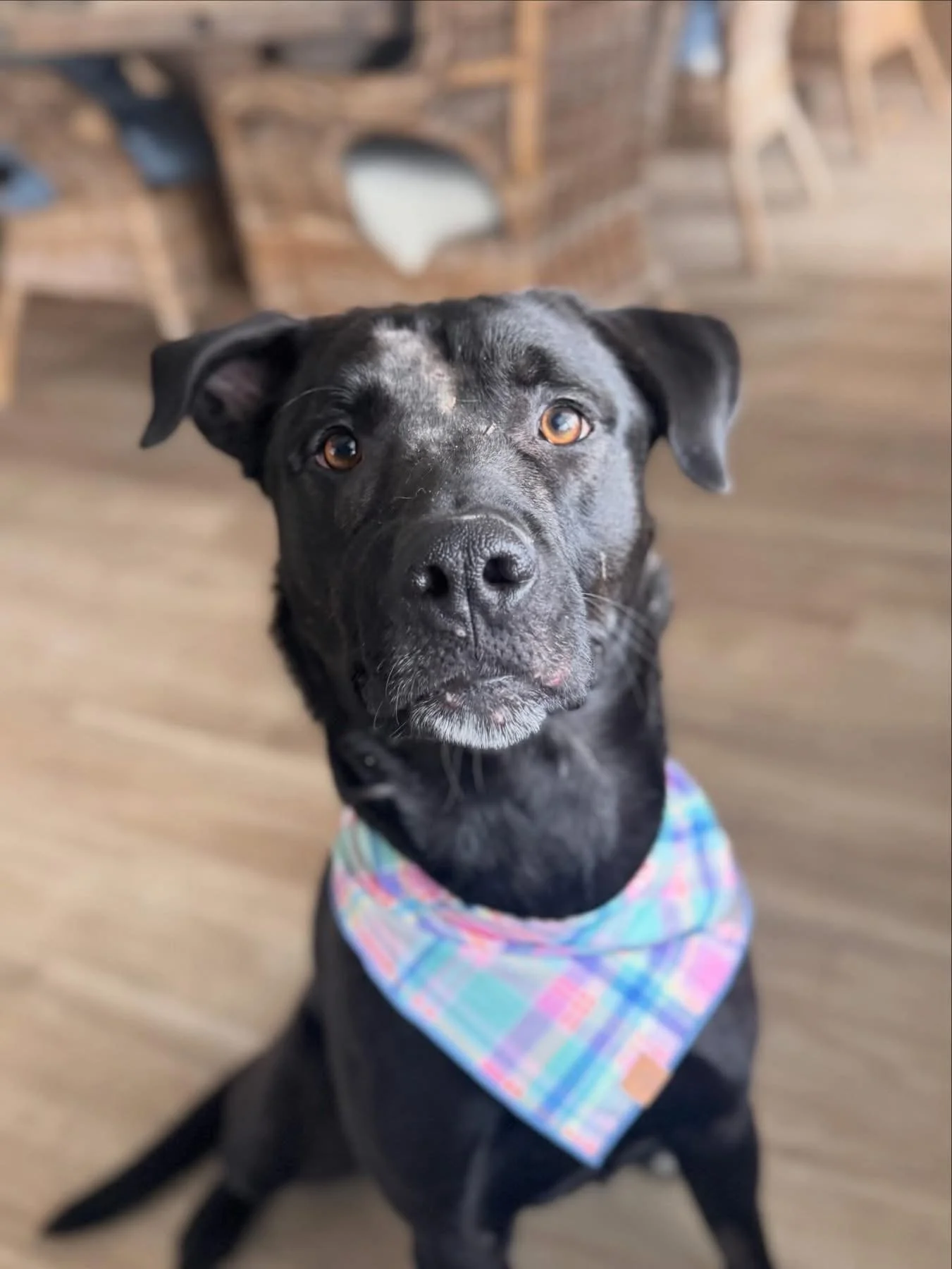 She has a shaved portion on her face where another dog got her and she needed some stitches, but she is all healed up and hasn’t let that stop her from being a happy go lucky girl and is ready to find her forever home! If you’re looking for a loving, playful girl, Mavis might be the perfect fit for your family.