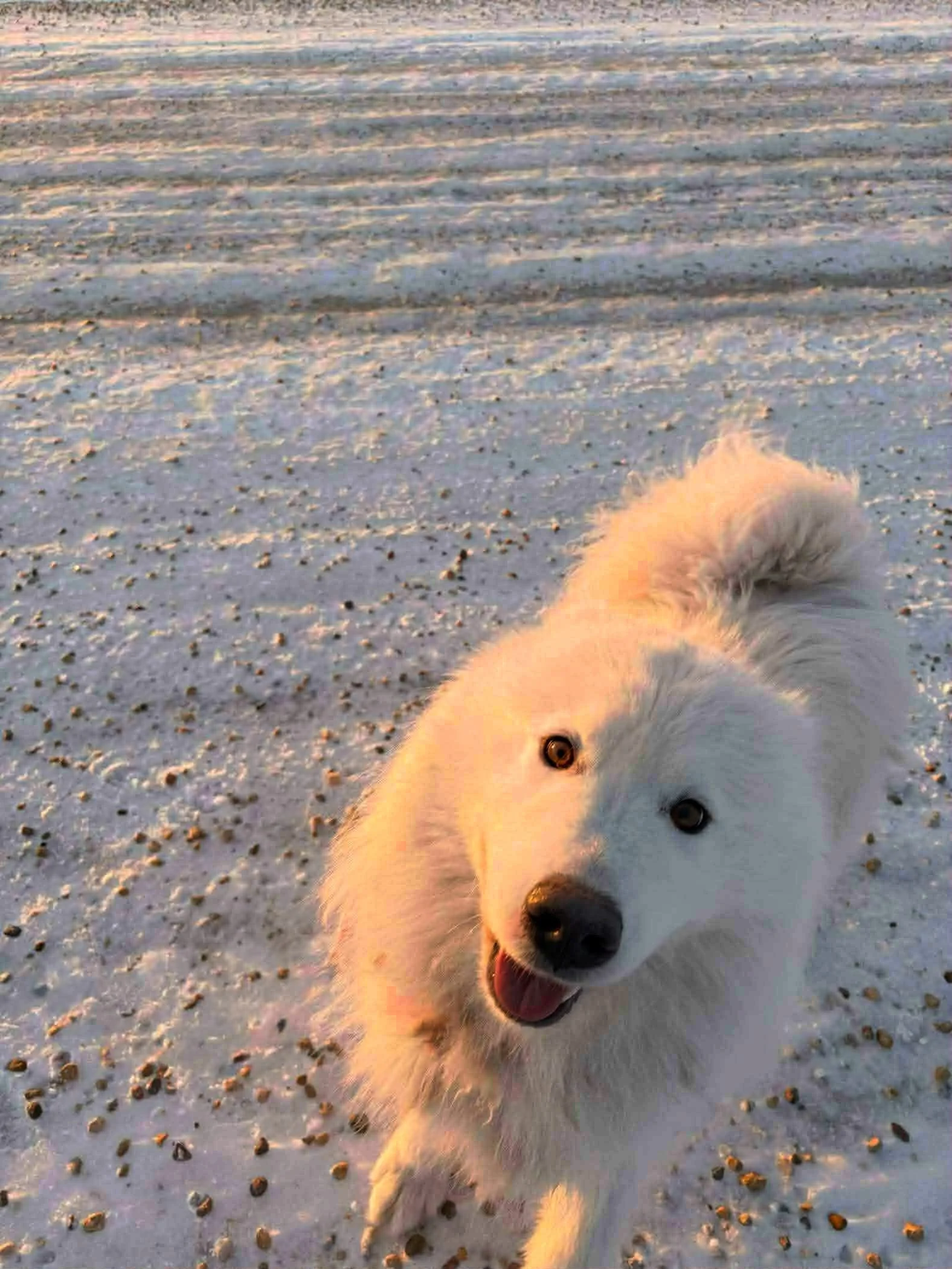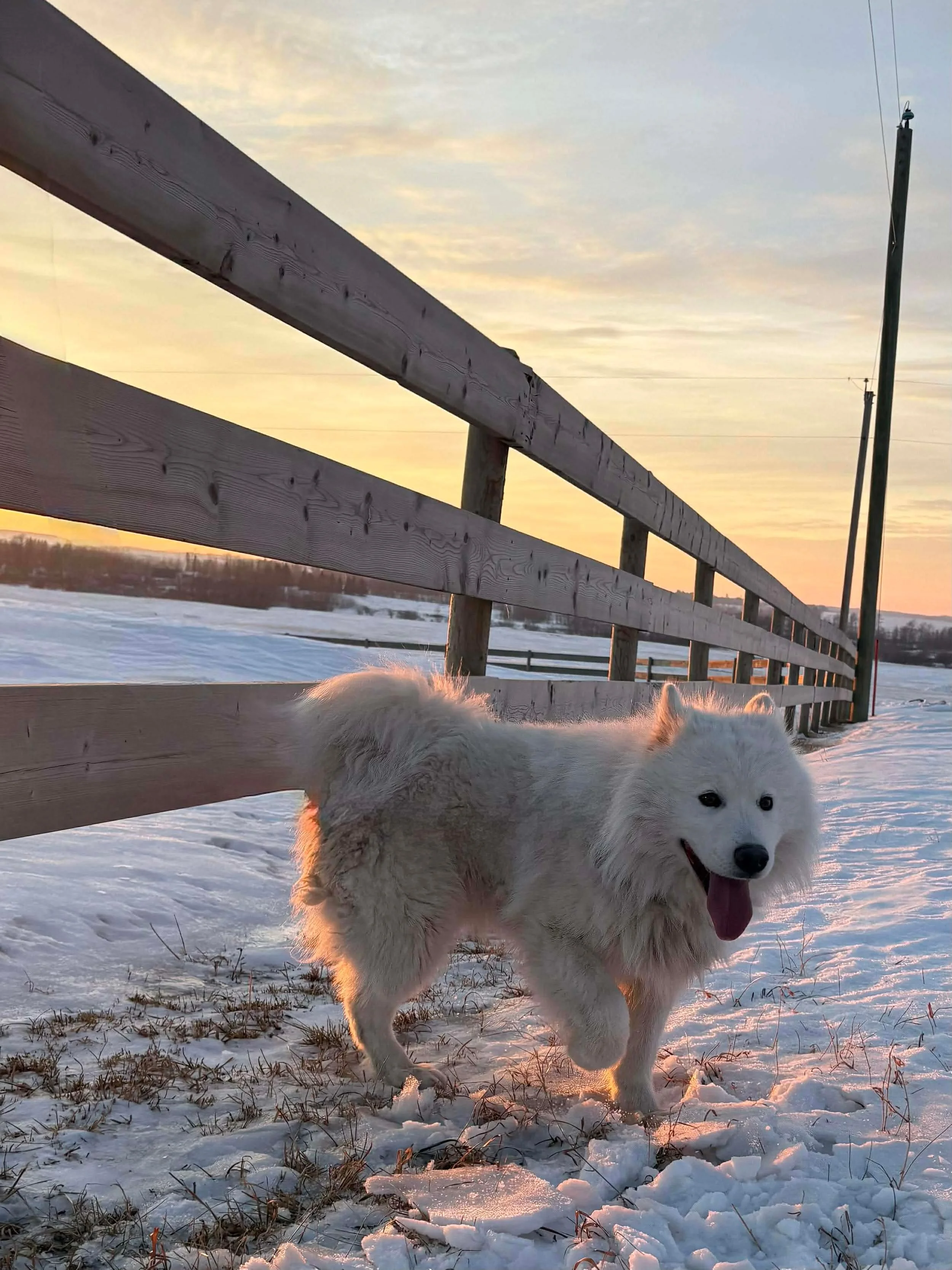 This fluffy Samoyed was found wandering west of KFC in Ponoka. He is wearing a black collar with a ripped cable leash on. No identification. If you know where this guy belongs please give us a call or text.